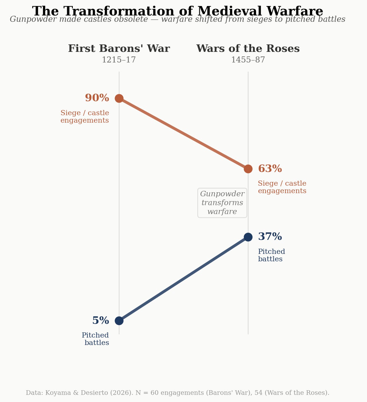 Warfare rapidly evolved. Sieges were still common but the ratio of sieges to pitched battles fell dramatically. This was because towns and castles that previously had a good chance of resisting a siege now surrendered. In our paper, we document this with data we collected on all the battles and sieges in the Wars of the Roses (1455-1487). While a majority of encounters were still sieges, the proportion of pitched battles dramatically increased.